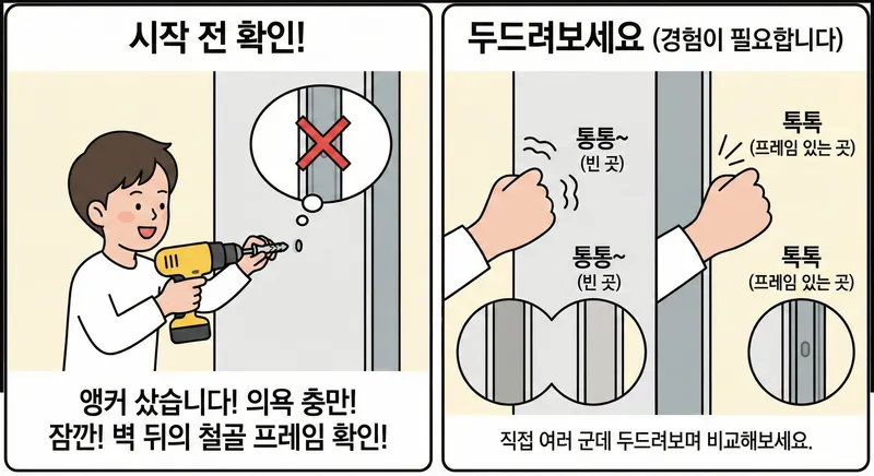 …이렇게 글로 쓰니까 뭔 소린지 모르겠죠? 저도 압니다. 직접 여러 군데 두드려보면서 비교해야 감이 옵니다. 같은 벽에서도 위치에 따라 소리가 다르거든요. 처음엔 다 똑같이 들리다가, 몇 번 해보면 ‘아, 여기는 다르네’ 하는 게 느껴집니다.