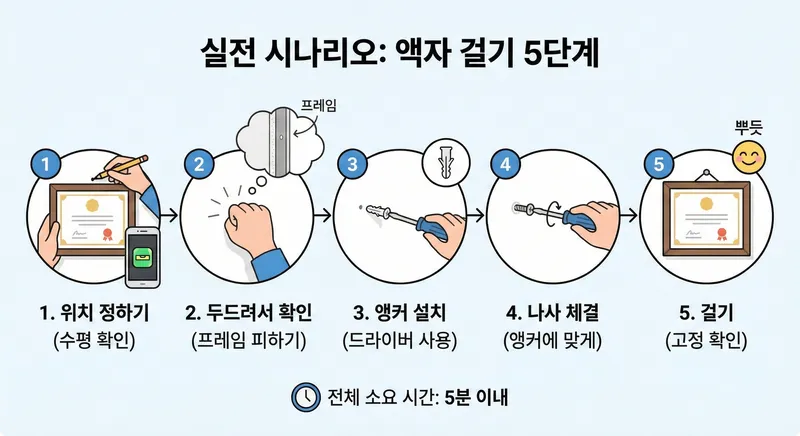잘못 박으면요? 가리든 메우든 하면 됩니다. 어차피 첫 번째 시도에 완벽할 필요 없어요. 저도 진료실 벽에 숨겨진 구멍이 몇 개 있습니다. 아무도 모릅니다.