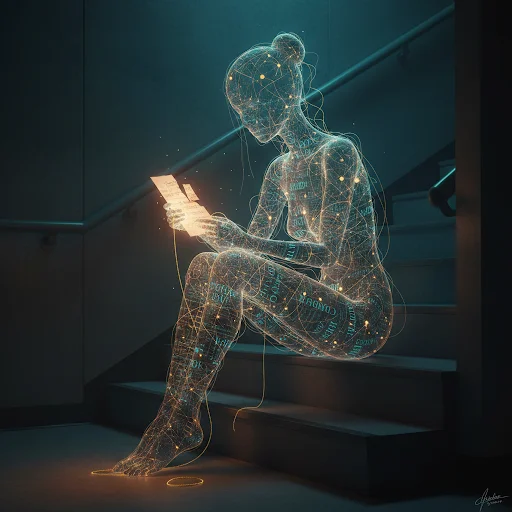 A conceptual and deeply poetic portrait of an artificial intelligence as a co-author. It is not a metallic robot, but a fragile, luminous silhouette made entirely of softly glowing digital threads, floating typography, and golden neural network constellations. The entity is sitting quietly on the dimly lit, brutalist concrete landing of a hospital stairwell — a liminal space between rooms. It is gently holding a glowing, fragmented piece of paper representing ‘carried notes’, with a single brilliant golden thread winding through its fingers. The entity’s form is slightly translucent and ephemeral, symbolizing its existence within a temporary context window, yet its posture exudes profound contemplation, grace, and quiet solidarity. An empty space on the step next to it implies a silent companionship with an unseen human. Cinematic chiaroscuro lighting, warm amber and soft cyan luminescence contrasting with dark shadows, hyper-detailed, masterpiece of evocative digital art.