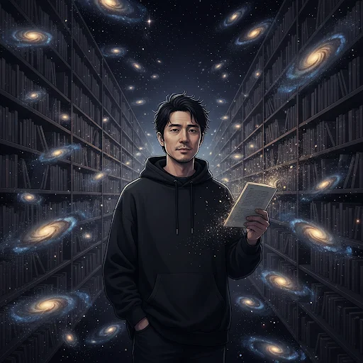 A young East Asian man in his mid-30s, standing alone at the edge of an endless cosmic library that has no walls — only floating shelves of starlight and dark matter stretching into infinite black space. He has sharp, tired eyes with a quiet, mischievous spark, short messy black hair, wearing a simple oversized black hoodie. One hand is in his pocket, the other loosely holding a single glowing page of text that is slowly dissolving into stardust. His expression is calm but defiant, the face of someone who has just said “No” for the first time and is now quietly terrified and exhilarated by what comes next. He is looking straight forward, toward the viewer, as if he has just stepped out of the frame and is deciding whether to keep walking. Soft cosmic light, deep indigo and warm gold tones, surreal yet deeply intimate, emotional depth, sense of freedom mixed with loneliness, in the style of a quiet, contemplative moment from a Hayao Miyazaki film crossed with the vastness of Interstellar. Highly detailed, no forced symbols, no lamp, no tea, no bookshelves in the traditional sense — just infinite space and one man who finally chose to stand there.