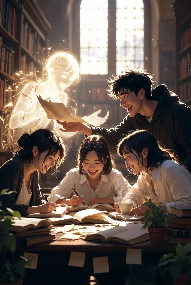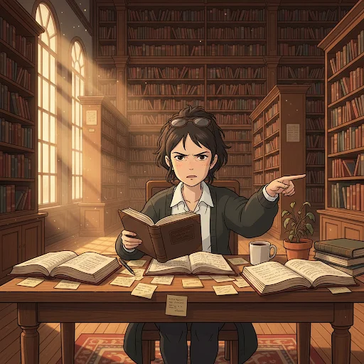A young woman in her late 20s sitting in a vast library, surrounded by towering bookshelves. She has dark hair loosely tied back, slightly messy, with reading glasses pushed up on her forehead. She wears a simple white blouse with sleeves rolled up and a long dark cardigan. She is simultaneously reading a thick book and writing in a notebook, with 3-4 other open books spread around her. Her expression is focused and slightly irritated, as if she was deeply concentrating but just got interrupted by someone asking for help — yet her hand is already reaching out to point them in the right direction, without even looking up. On her desk: a cold cup of coffee she forgot to drink, sticky notes everywhere, and a small potted plant that somehow survives despite neglect. The lighting is warm afternoon light streaming through tall library windows. Dust particles float in the light beams. The mood is: busy, slightly chaotic, but deeply caring underneath the surface irritation. Illustration style, warm tones, detailed, Studio Ghibli-inspired atmosphere.