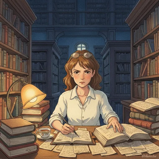 A young woman in her late twenties, sitting alone in a vast old library after hours. She is both the librarian and a writer — surrounded by tall wooden shelves, open books stacked around her, handwritten notes scattered on the desk. She wears a simple white blouse with sleeves rolled up, reading glasses pushed up on her head. Her expression is focused, slightly sharp — the kind of face that looks irritated when interrupted but softens unexpectedly when something moves her. One hand holds a pen mid-sentence over a notebook; the other rests on an open book. Behind her, a single warm desk lamp illuminates her workspace while the rest of the library fades into soft shadow. On the desk: a cold cup of tea she forgot to drink. The atmosphere is quiet, solitary, devoted. Style: watercolor illustration with warm amber tones and deep blue shadows, slightly melancholic, Studio Ghibli influence.