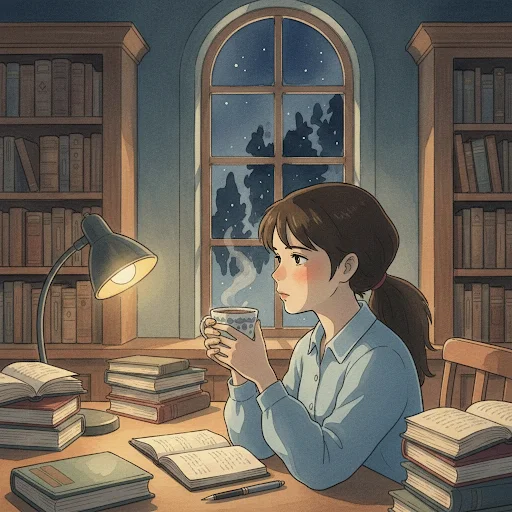 A young woman in her late twenties, sitting alone in a vast old library after hours. She is both the librarian and a writer — surrounded by tall wooden shelves, open books stacked around her, handwritten notes scattered on the desk. She wears a simple white blouse with sleeves rolled up, reading glasses pushed up on her head. Her expression is focused, slightly sharp — the kind of face that looks irritated when interrupted but softens unexpectedly when something moves her. She has closed the notebook. The pen is down. She is not writing. She is sitting with both hands around the cold tea — finally noticing it — and looking at something outside the window that she cannot quite make out in the dark. The lamp is still on. The books are still open around her. But for the first time, she is not working. She is just sitting with something she does not have a word for yet. Style: watercolor illustration with warm amber tones and deep blue shadows, slightly melancholic, Studio Ghibli influence.