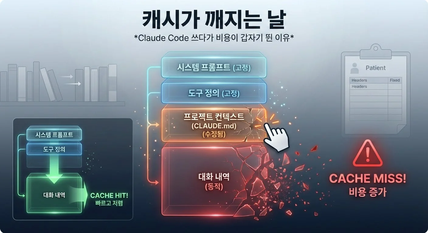 Claude Code 쓰다가 비용이 갑자기 뛴 이유. 프롬프트 캐싱 구조를 이해하고 나서 — 기억의 배치 순서가 내용보다 중요하다는 것을 알게 되었다.