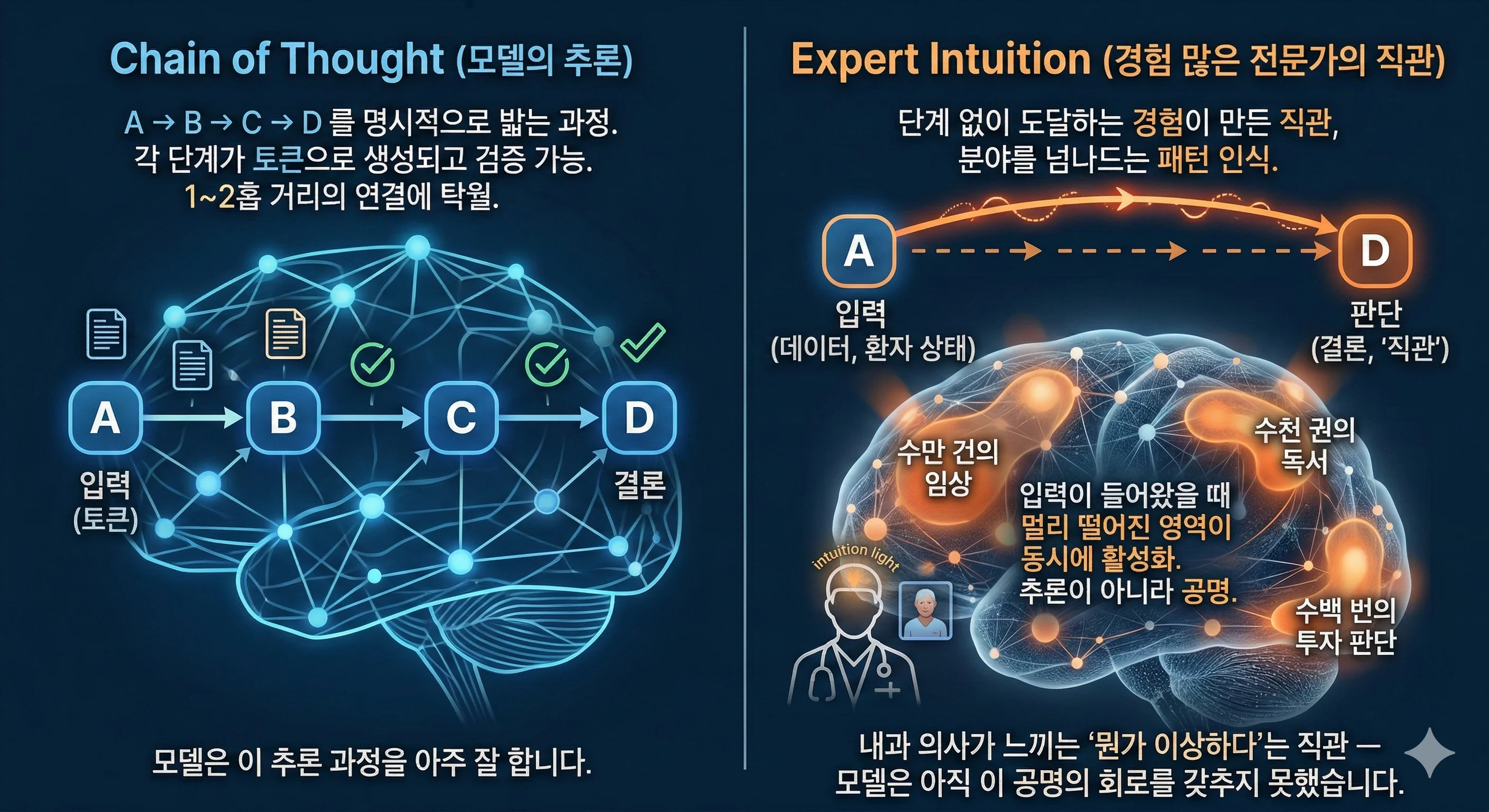 내과 의사가 환자를 보고 “뭔가 이상하다”고 느끼는 것 — 혈압도 정상이고, 혈액검사도 정상인데, 15년의 임상이 만든 회로가 울리는 것 — 이것을 모델은 아직 못 한다. 데이터를 주면 분석은 하지만, 데이터에 없는 방향으로 고개를 돌리지는 못한다.